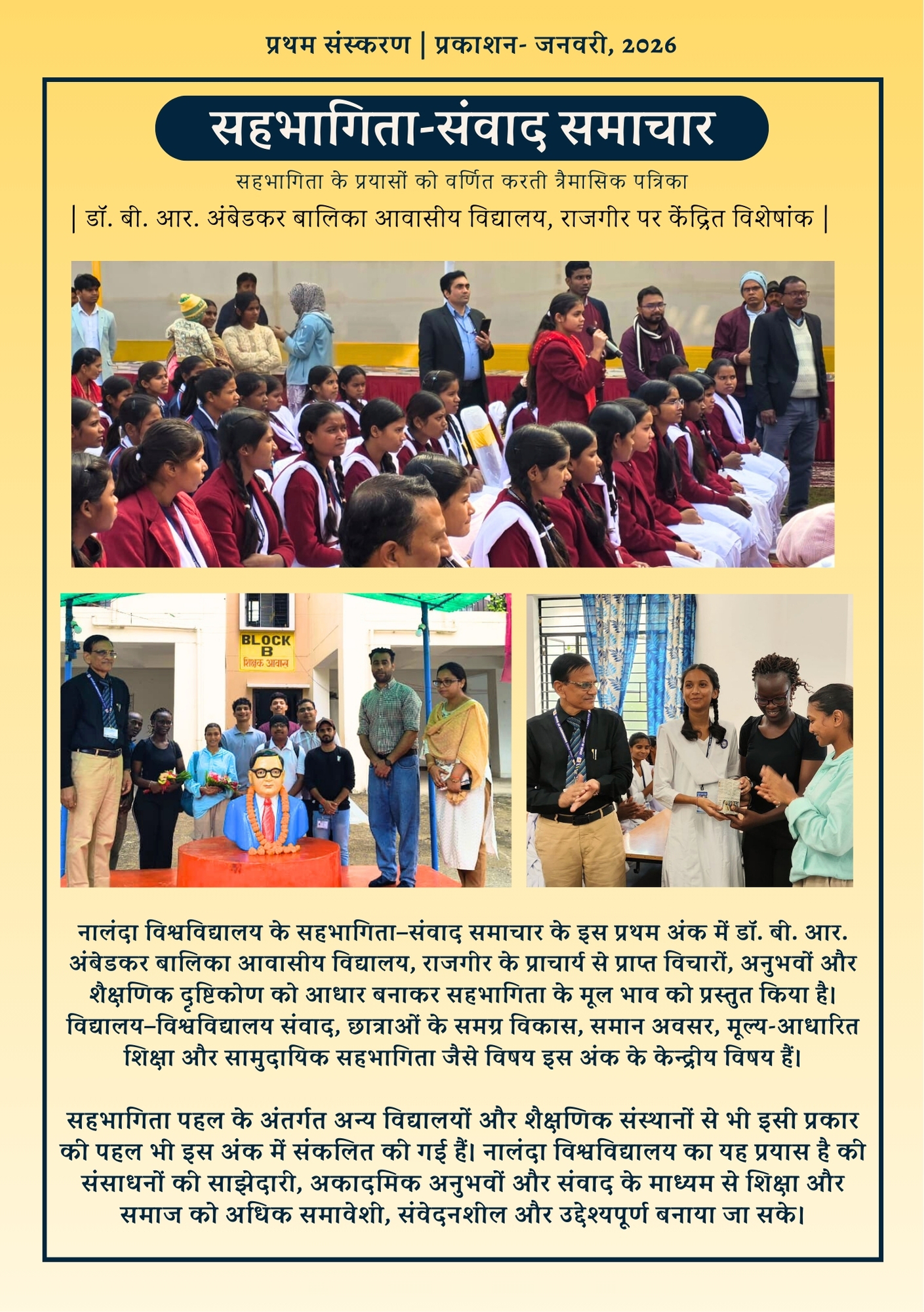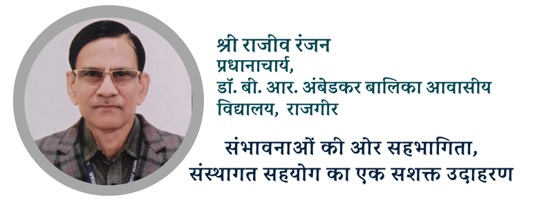 संस्थागत स्तर पर दोनों संस्थानों के बीच संरचित अकादमिक संवाद आयोजित हुए, जिनकी अध्यक्षता नालंदा विश्वविद्यालय के माननीय कुलपति ने की। ये संवाद प्रतीकात्मक नहीं, बल्कि सार्थक, सम्मानजनक और समाधान-उन्मुख रहे, जिनमें सरकारी आवासीय विद्यालय की वास्तविकताओं, कार्यान्वयन की चुनौतियों और संभावित समाधानों पर खुलकर चर्चा हुई। आगामी चरण में यह साझेदारी वर्षा जल संचयन, संरचित अपशिष्ट प्रबंधन और पर्यावरण-संवेदनशील परिसर व्यवहार जैसी पहलों के संयुक्त क्रियान्वयन की परिकल्पना करती है, जो सीख के लिविंग लैबोरेटरी के रूप में कार्य करेंगी। समग्र रूप से यह सहयोग दर्शाता है कि विश्वविद्यालय और विद्यालय समान भागीदार के रूप में शैक्षणिक एवं सामाजिक उद्देश्यों को आगे बढ़ा सकते हैं। सहभागिता के माध्यम से नालंदा विश्वविद्यालय और डॉ. बी. आर. अंबेडकर आवासीय विद्यालय ने ऐसा सहभागिता मॉडल गढ़ा है, जिसमें ज्ञान का प्रवाह द्विदिश होता है और भविष्य के लिए अवसर, आकांक्षा तथा उत्तरदायी नागरिकता का विस्तार होता है।